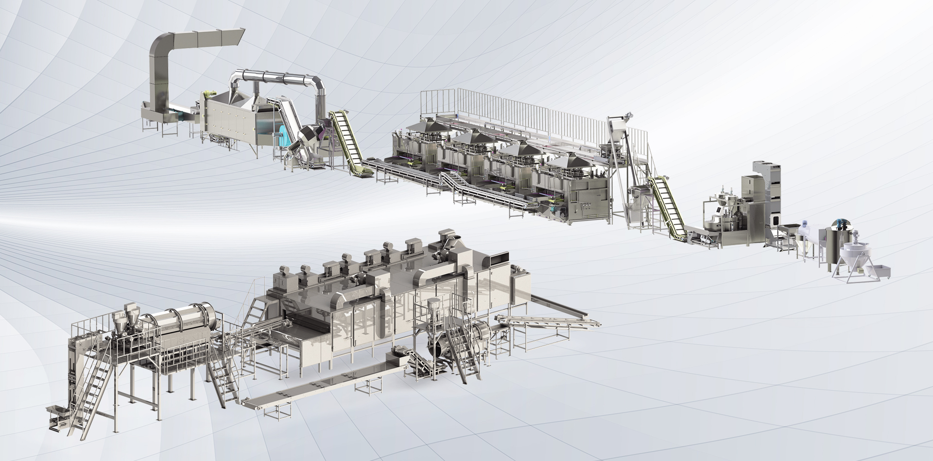 該生產線廣泛用于堅果、籽類、裹粉顆粒食品、薯片、薯條、膨化食品等加工生產。
